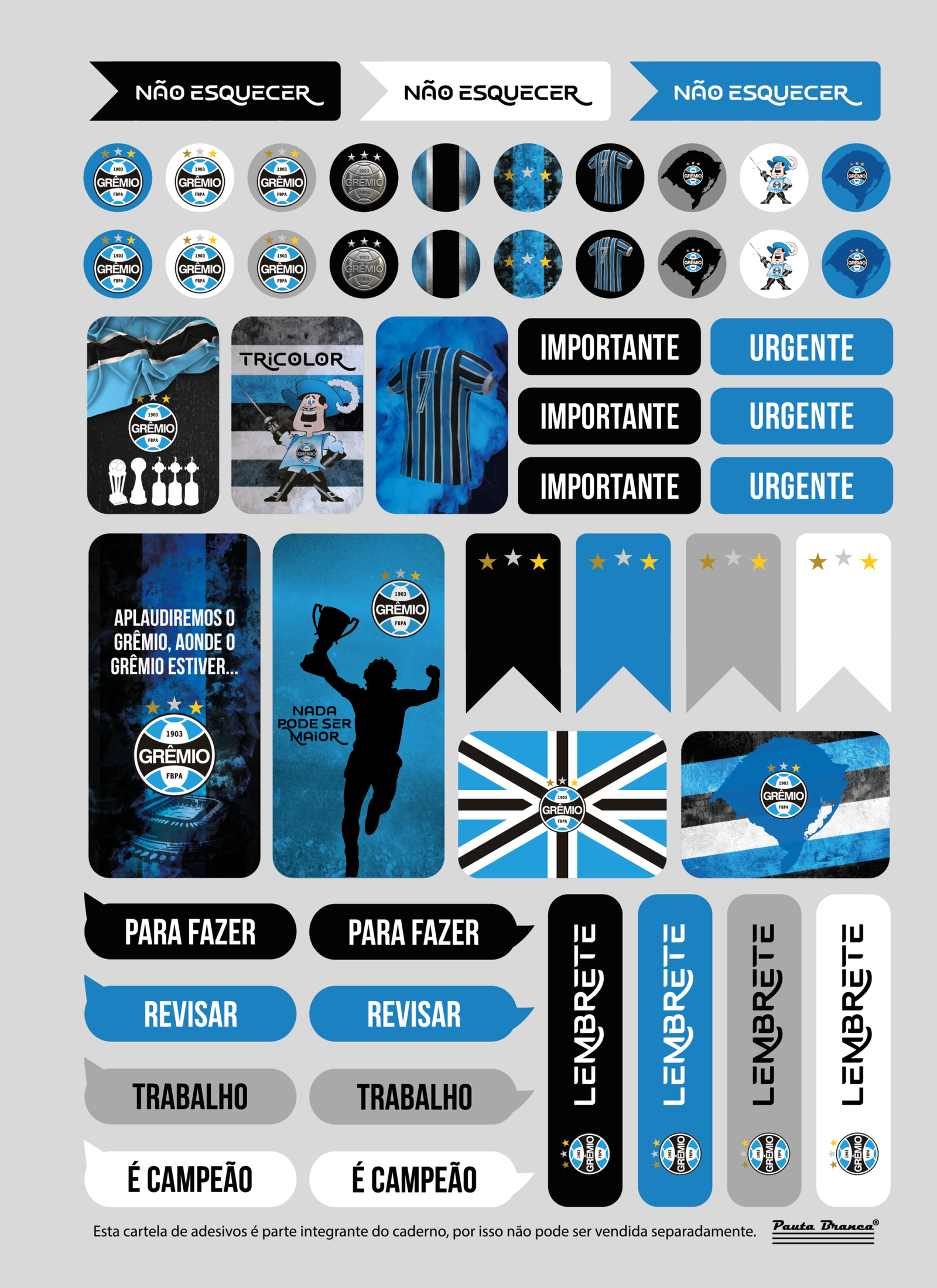 • Brinde exclusivo: cartela de adesivos temáticos do Grêmio (escudos, camisas, mascote, frases como “Não Esquecer”, “Importante”, “Urgente”, “É Campeão”, “Tricolor”, “Nada Pode Ser Maior” e mais!) para personalizar as páginas e deixar tudo mais gremista ainda!