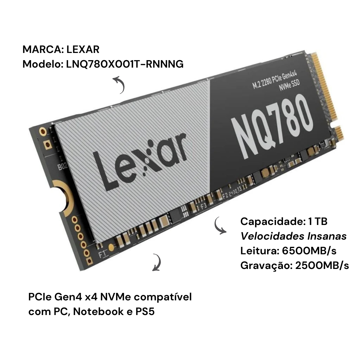 O Lexar NQ780 1TB M.2 2280 PCIe Gen4x4 NVMe SSD é a escolha ideal para quem busca alto desempenho, grande capacidade e excelente custo-benefício em upgrades de PC, notebook ou até PS5!