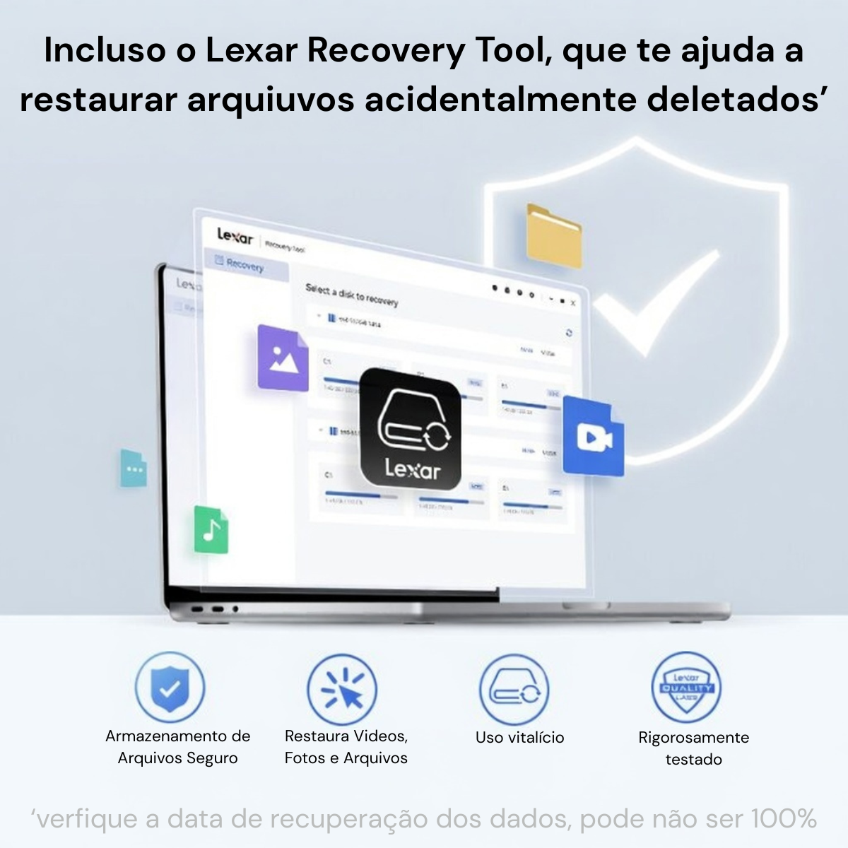 Software incluso: Lexar DiskMaster (gerenciamento completo: atualizações de firmware, monitoramento de saúde S.M.A.R.T, teste de performance, apagamento seguro) + Lexar Recovery Tool (recuperação de arquivos deletados acidentalmente, taxa não 100%, mas útil!).