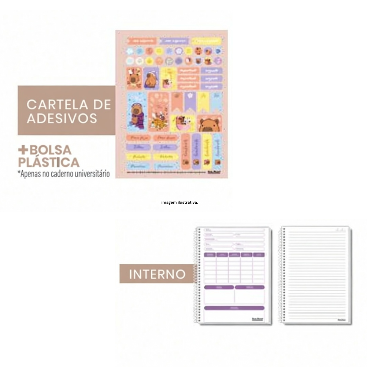 - Cartela de adesivos inclusa (temas capivaras, emojis e elementos fofos) para personalizar e organizar suas páginas