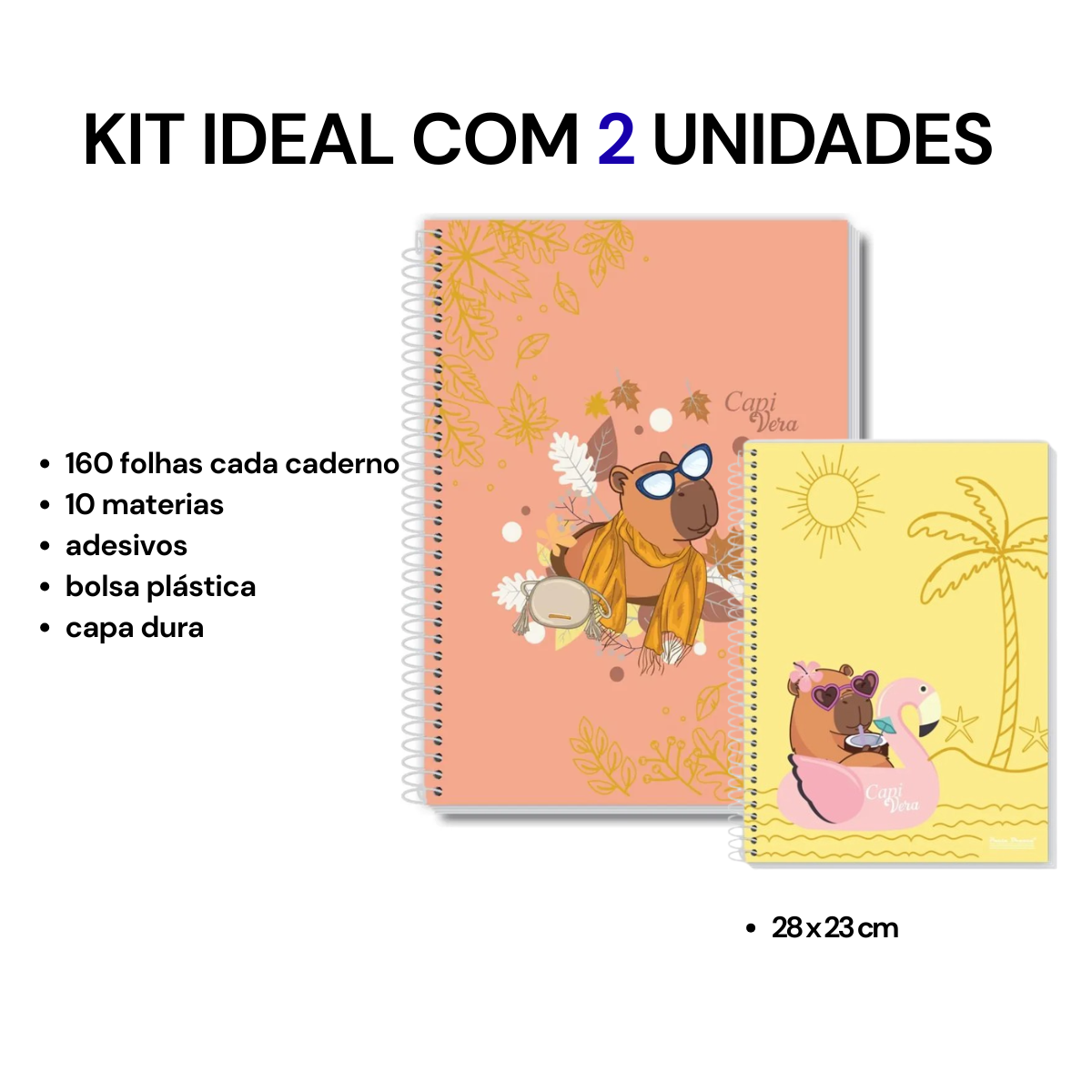 Kit 2 Cadernos Universitários Capa Dura Coleção Capi Vera 10 Matérias 160 Folhas + Adesivos e Plástica transparente interna – Modelos Sortidos