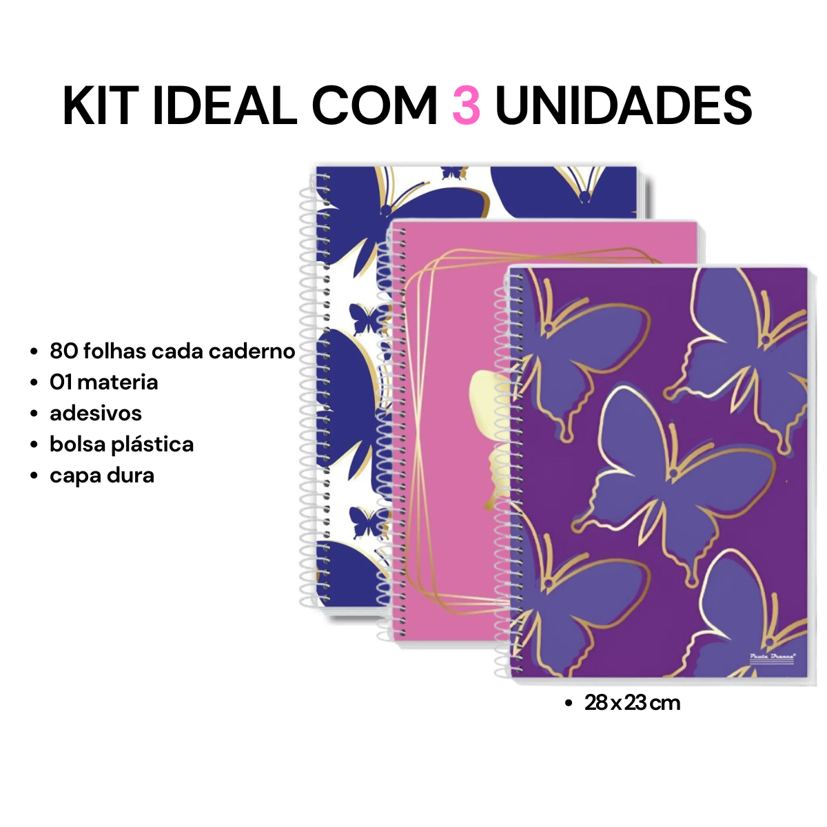 Kit com 3 Cadernos Universitários Capa Dura – Coleção Fly (Modelos Sortidos) LANÇAMENTO! Com hot stamping dourado que faz as borboletas voarem!